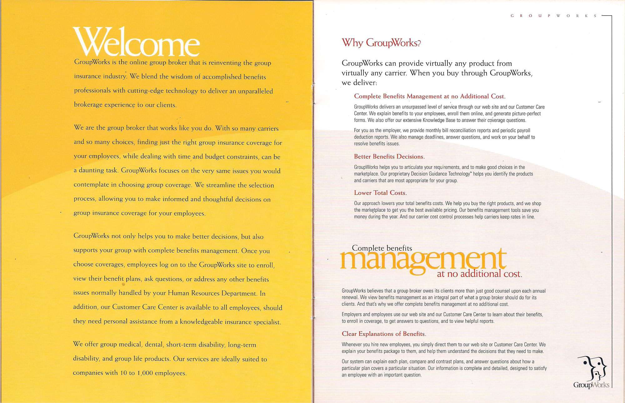 Brochure: GroupWorks, a start-up insurance brokerage, needed to introduce itself to the group insurance market. They were interested in targeting multiple audiences with a set of introductory relationship brochures.
